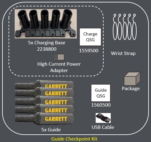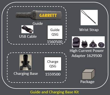 The kit contains a Guide device with one charging base, a high-power adapter and a USB charging cable.