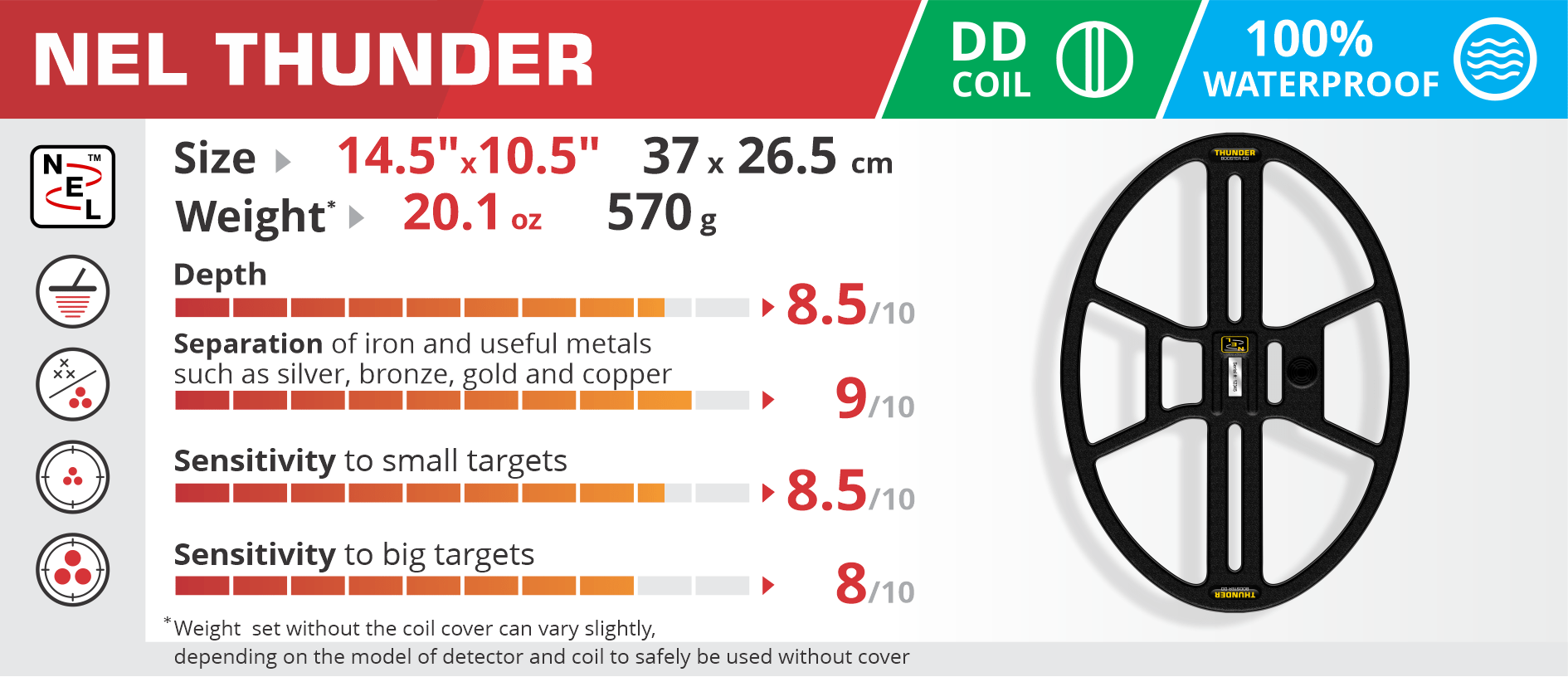 The NEL Thunder Coil is a powerful, precision-engineered search coil designed for metal detectorists who demand both depth and accuracy. Measuring 14.5" x 10.5" (37 x 26.5 cm) and weighing only 570 g (20.1 oz), it delivers outstanding performance while maintaining excellent balance and manoeuvrability.