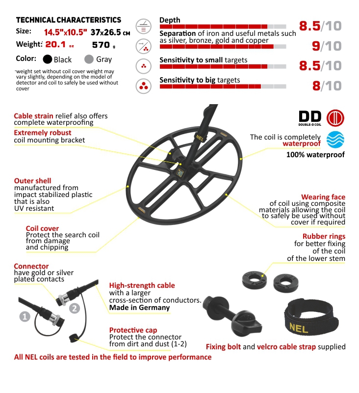 The NEL Thunder is the latest advancement in search coil technology, offering an exceptional balance of detection depth and target selectivity. Designed for precision and versatility, it performs best with a slow swing, detecting not only large and medium-sized targets but also small objects weighing under 1 gram at depths of up to 20 cm.