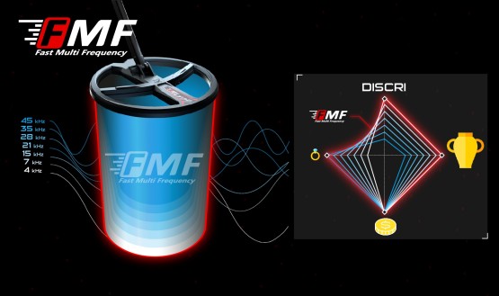 The graphic represents the sensitivity and the iron discrimination capability depending on the frequency and the advantage of Fast Multi-Frequency programs covering a large spectrum of targets. This shows only a basic outline which can differ depending on the programs and actual conditions.